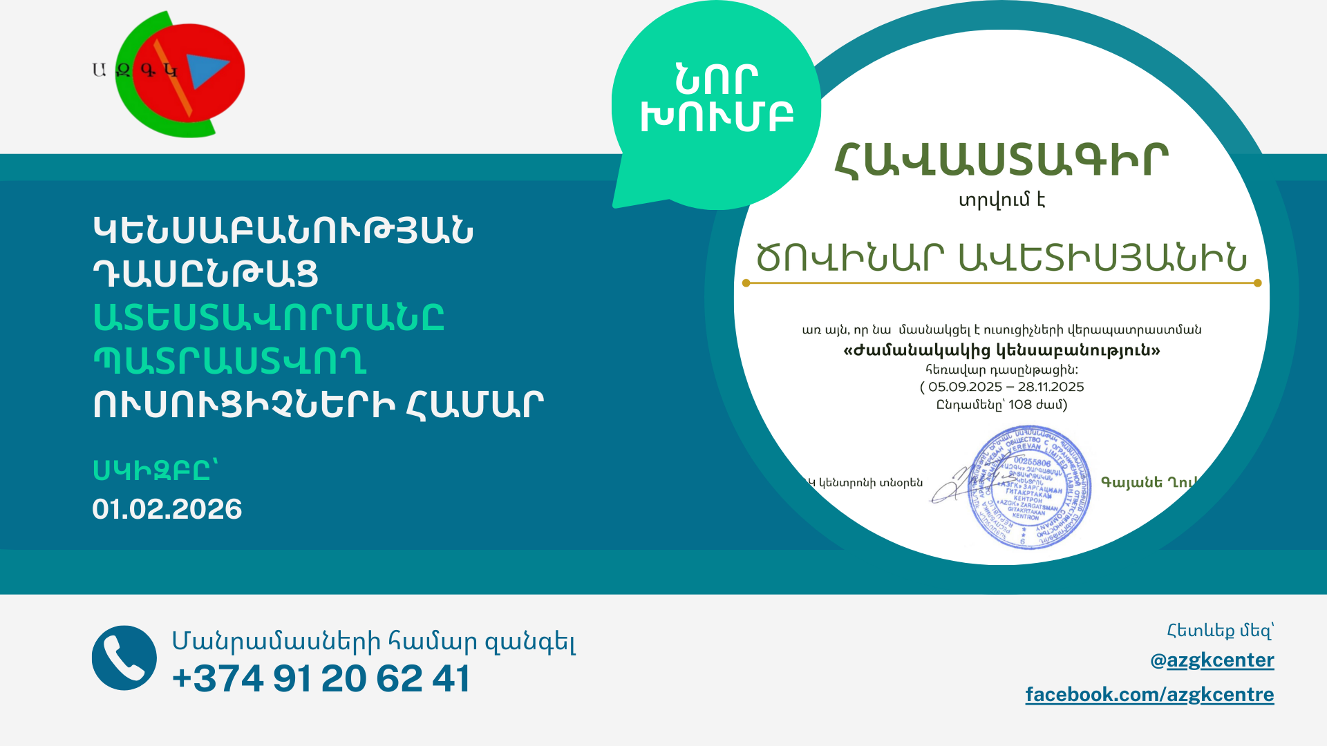 ԱԶԳԿ կենտրոնը 2026 թ փետրվարի 1-ից մեկնարկում է Կենսաբանության դասընթաց՝ ատեստավորմանը պատրաստվող ուսուցիչների համար։ Ձևաչափը՝ հեռավար (online)։